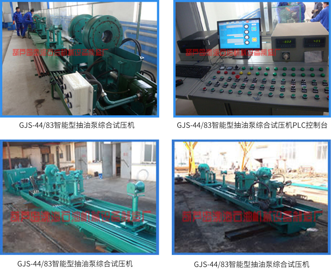 GJS-44/83智能型抽油泵綜合試壓機(jī)是我廠新研制的抽油泵試壓機(jī),主要用于舊抽油泵拆裝和新舊抽油泵檢測(壓力檢測和漏失量檢測)。試壓過程由PLC自動(dòng)控制,漏失量自動(dòng)計(jì)量。計(jì)算機(jī)顯示壓力、扭矩、漏失量數(shù)據(jù),且具有自動(dòng)儲(chǔ)存、報(bào)表、打印等功能。