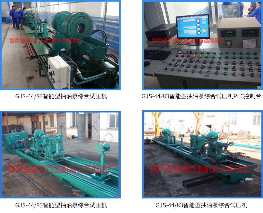 GJS-44/83智能型抽油泵綜合試壓機是我廠新研制的抽油泵試壓機,主要用于舊抽油泵拆裝和新舊抽油泵檢測(壓力檢測和漏失量檢測)。試壓過程由PLC自動控制,漏失量自動計量。計算機顯示壓力、扭矩、漏失量數(shù)據(jù),且具有自動儲存、報表、打印等功能。